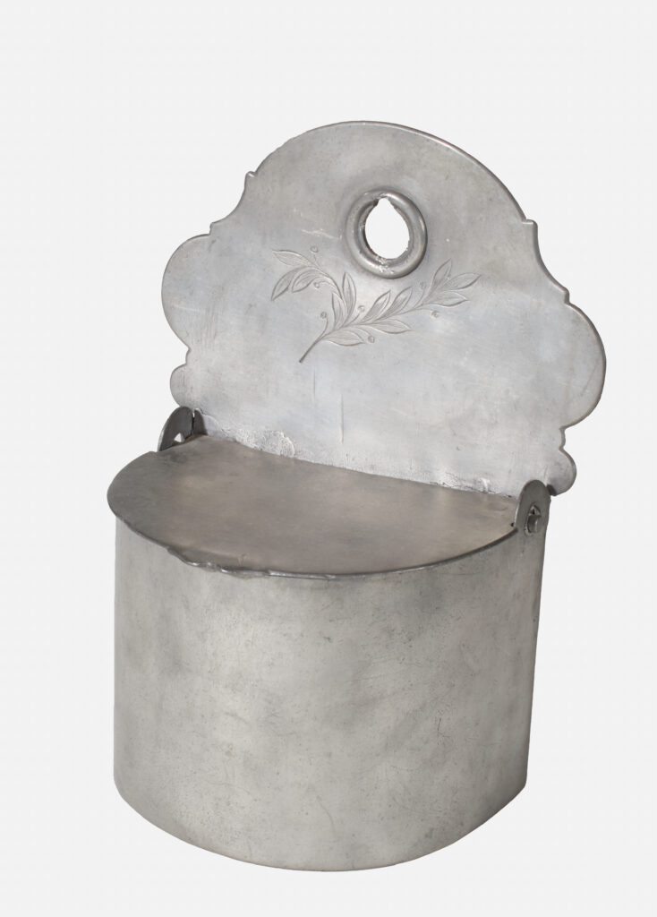 Salzfass aus Zinn mit floraler Gestaltung. Diese Deckeldose stammt aus der Zeit um 1800, sie diente zur Aufbewahrung eines kostbaren Nahrungsmittels, Salz.Fotos/Dateien: