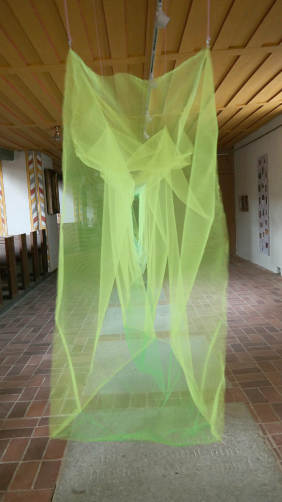 Wie ein feines „Rodde-Netz“ überziehen die Werke des Künstlers den Kirchenraum der St.-Laurentius-Kirche zu Schönberg. Das Ausstellungskonzept von Christoph Rodde ist nicht monolithisch gedacht, vielmehr sieht er seine Arbeiten als bildliche Verfänger für Assoziationen und Gedanken oder eine Art Neutralisatoren, die auf Vorhandenes reagieren, es intensivieren oder auch konterkarieren. Entdeckt werden können sie vom Be-Suchenden im Kleinen, im Größeren, in Gruppen. In seinen eigens für Schönberg gefertigten Arbeiten platziert er, in der ihm eigenen Handschrift, eigentümliche Materialien in ungewöhnlichen Nachbarschaften als Genähtes, Gewickeltes, Gestricktes, Gezeichnetes, Geschnittenes. Neben den von Rodde ausgewählten Materialien spielen auch die angewandten Techniken eine wesentliche Rolle bei der Suche des Künstlers nach dem, was die Dinge ausmacht und zusammenhält.