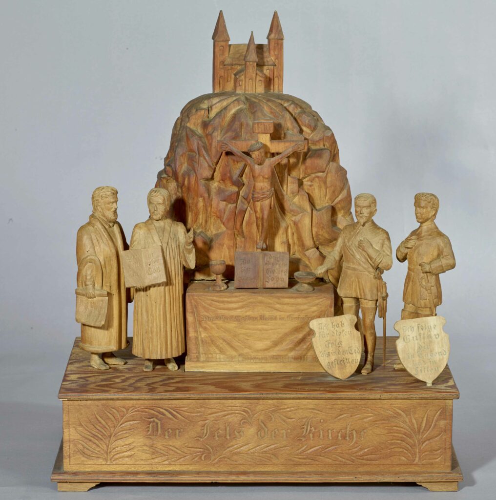 Holzschnitzwerk von Heinrich Harms, um 1920. "Der Fels der Kirche" Dieses beliebte Bilderbogenmotiv wurde durch den Volkskünstler skulptural umgesetzt.Fotos/Dateien:
