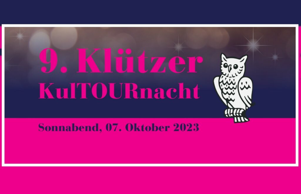 Am Samstag, 07.10.2023, findet die 9. Klützer KulTOURnacht statt. Es wird ein vielfältiges, buntes Programm an verschiedenen Orten in der Stadt präsentiert: mit Live-Musik, Modenschauen, Kunsthandwerk, Lichtinstallationen, Lesungen und Bildervorträgen, Turmführungen, Konzerten, Puppenspiel, Rikscha-Fahrten, Stadtführungen u. v. m. und mit einem reichhaltigen kulinarischen Angebot.