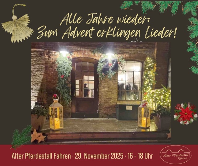 Am Samstag vor dem 1. Advent, am 29. November 2025, lädt der Alte Pferdestall Fahren e. V. ab 16 Uhr zum geselligen Einsingen zur Vorweihnachtszeit ein.