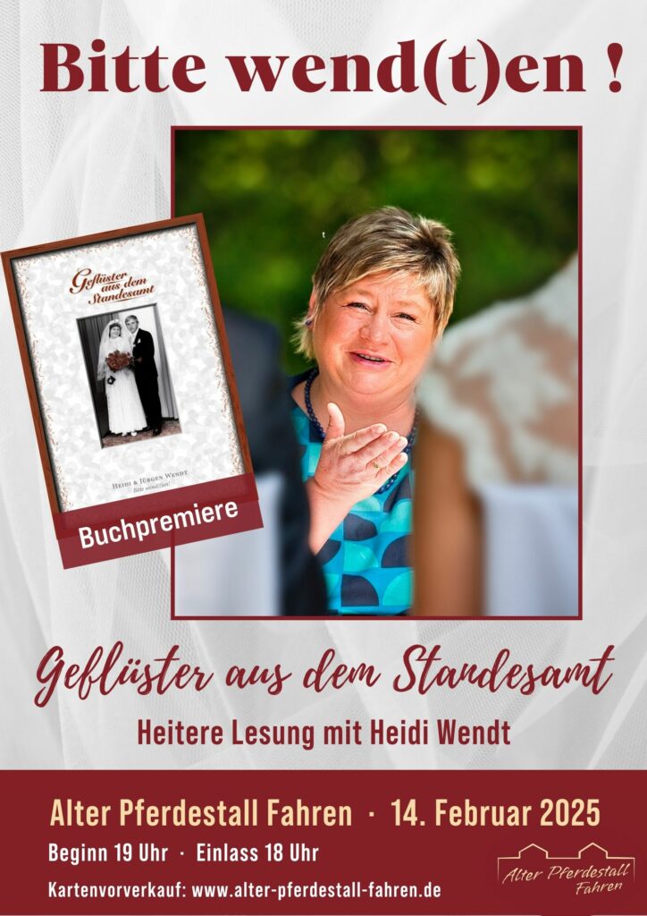 Am Freitag, den 14.02.2025, um 19.00 Uhr heißt es wieder im Alten Pferdestall in Fahren „Bitte wend(t)en!“, wenn unsere lokale und beliebte Autorin und Standesbeamtin Heidi Wendt Geschichten vorliest. Dieses Mal wird es eine Buchpremiere geben. Heidi Wendt stellt ihr neues Buch mit dem geheimnisvollen Titel „Geflüster aus dem Standesamt“ vor. Sie löst damit ein lange angekündigtes Versprechen ein.