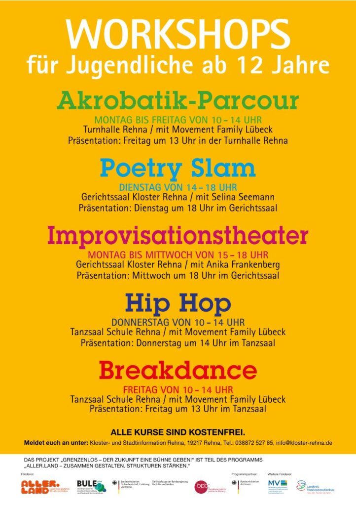 Alle Workshops sind kostenfrei. Anmelden kann man sich in der Kloster- und Stadtinformation Rehna, unter der Telefonnummer 038872 / 527 65 oder per Email an info@kloster-rehna.de