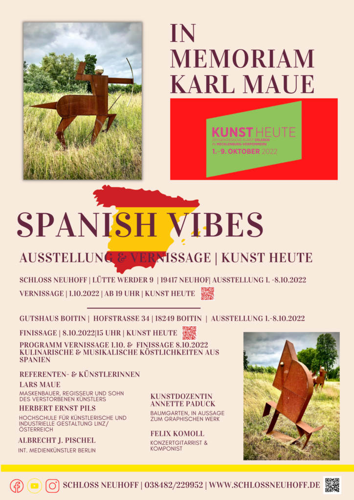 Im Rahmen von „Kunst heute“ gibt es eine Ausstellung und Vernissage mit Kulinaristik und Musik aus Spanien um Schloss Neuhoff.