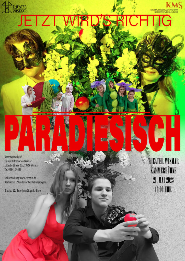 „Jetzt wird‘s richtig paradiesisch“ besticht durch originelle, humorvolle Texte, umrahmt von abwechslungsreicher Musik und Tanzeinlagen und eignet sich für Jugendliche und Erwachsene.
