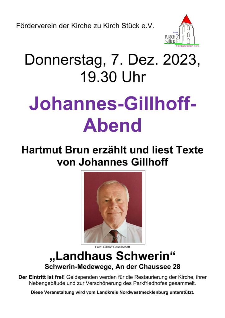 Schwerin-Medewege: Der Förderverein der Kirche zu Kirch Stück e.V. setzt in seinem Win-terprogramm die Reihe plattdeutscher Lesungen am Donnerstag, den 7. Dezember 2023 um 19.30 Uhr mit einem Johannes Gillhoff-Abend mit dem Leiter der Gillhoff-Gesellschaft, Hartmut Brun, fort.