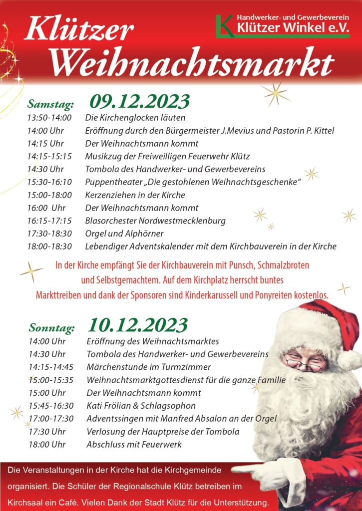 Der 2-tägige Weihnachtsmarkt des Handwerker- und Gewerbevereins Klützer Winkel e.V. bietet ein buntes Programm mit Ponyreiten, Puppenspiel, Tombola, Kinderkarussell, Blas- und Orgelmusikik u. v.. m. Rund um den Weihnachtsbaum werden in festlich geschmückten Holzhütten außerdem süße und deftige Köstlichkeiten, heiße und kalte Getränke, Kunst- und Keramikarbeiten, Bioprodukte, Textildrucke und noch Vieles mehr angeboten. Mit einem Höhenfeuerwerk am Sonntag, um 18:00 Uhr, findet der Klützer Weihnachtsmarkt seinen Abschluss.