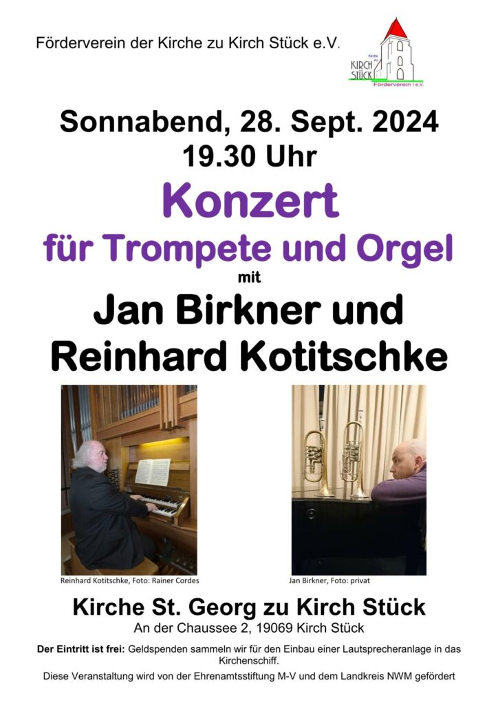 Der Förderverein der Kirche zu Kirch Stück e.V. setzt seine Veranstaltungsreihe am Sonnabend, den 28. September um 19.30 Uhr mit einem Konzert für Trompete und Orgel in unserer Kirche fort. Die Solisten sind Jan Birkner, Trompete und Reinhard Kotitschke an der Börger-Orgel.
