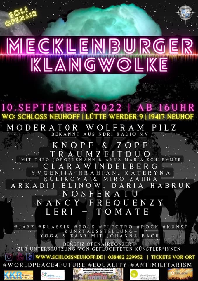 Am 10. September ist Vollmond und wenn langsam die Nacht über Schloss Neuhoff herein bricht und der Nebel über die Wiesen zieht, ja dann kehren die Gestalten der Nacht auf der Mecklenburger Klangwolke ein…. Der berühmte Vampir Nosferatu (mit Lars Maue, Wismar) kommt zu einem Gastauftritt besuchen. Im Anschluss tritt Nancy Frequenzy auf (Grevesmühlen) und es gibt elektronische Musik von Leri (Ukraine) und elektro Swing von Tomate /Sven (Olgashof).