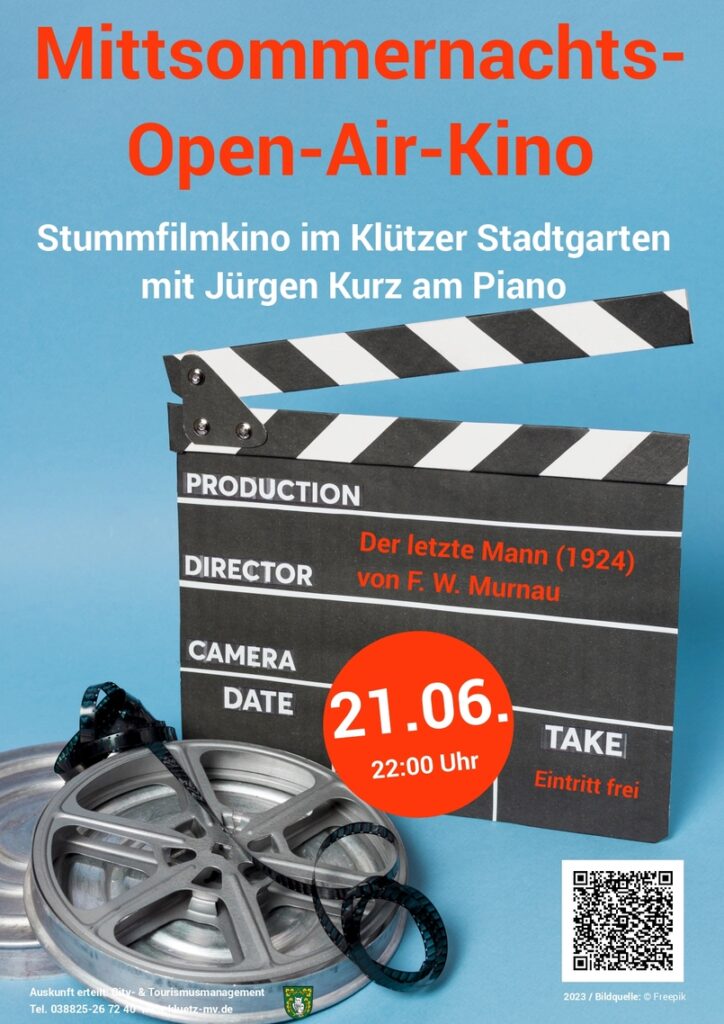 Erleben Sie die Mittsommernacht bei einem Open-Air-Kinoabend im Stadtgarten von Klütz. Gezeigt wird „Der letzte Mann“ von F. W. Murnau. Die Vorführung des Stummfilm-Klassikers aus dem Jahr 1924 wird live am Piano begleitet von Jürgen Kurz.