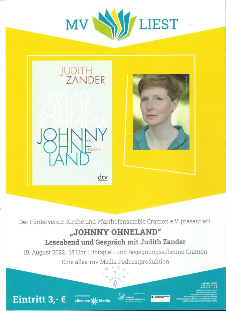 Autorin Judith Zander wird am 19. August in der Hörspiel- und Begegnungsscheune Cramon erwartet. Im Podcast-Interview für die Reihe „MV liest“ wird sie ihren Coming-of-Age-Roman „Johnny Ohneland“ vorstellen und daraus lesen. Judith Zander wurde 1980 in Anklam geboren und lebt heute in Jüterbog. Sowohl ihre Prosa als auch ihre Lyrik wurden vielfach ausgezeichnet, u. a. mit dem 3sat-Preis des Ingeborg-Bachmann-Wettbewerbs, dem Uwe Johnson-Förderpreis, dem Wolfgang-Weyrauch-Förderpreis und 2021 mit dem Fontane-Literaturpreis. Ihr Roman handelt von der Kindheit, der Jugend und den ersten erwachsenen Jahren einer Frau auf der Suche nach einer eigenen Identität. Hauptfigur ist Joana Wolkenzin, die früh weiß, dass sie anders ist. Sie liest stundenlang und lernt Songtexte auswendig; später verliebt sie sich in Jungs und in Mädchen. Im vorpommerschen Niemandsland der Neunziger gibt sie sich einen neuen Namen: Johnny. Aber bringt ein neuer Name auch neues Glück? Als die Mutter über Nacht die Familie verlässt, kreisen Johnny, ihr Bruder Charlie und ihr Vater auf wackligen Bahnen um eine leere Mitte. Schließlich macht Johnny sich auf die Suche nach einem Leben und einer Erzählung, die ihren eigenen Vorstellungen entsprechen, in Deutschland, Finnland und Australien.