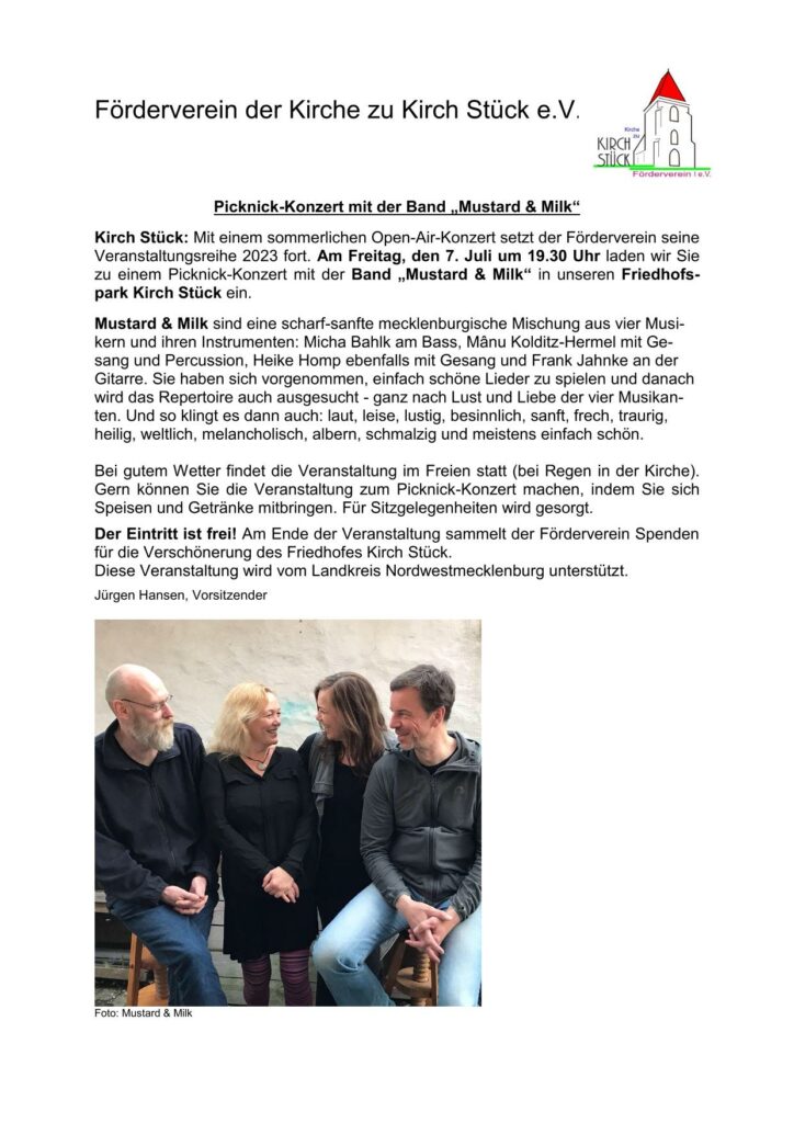 Am Freitag, den 7. Juli um 19.30 Uhr laden wir Sie zu einem Picknick-Konzert mit der Band „Mustard & Milk“ in unseren Friedhofspark Kirch Stück ein.