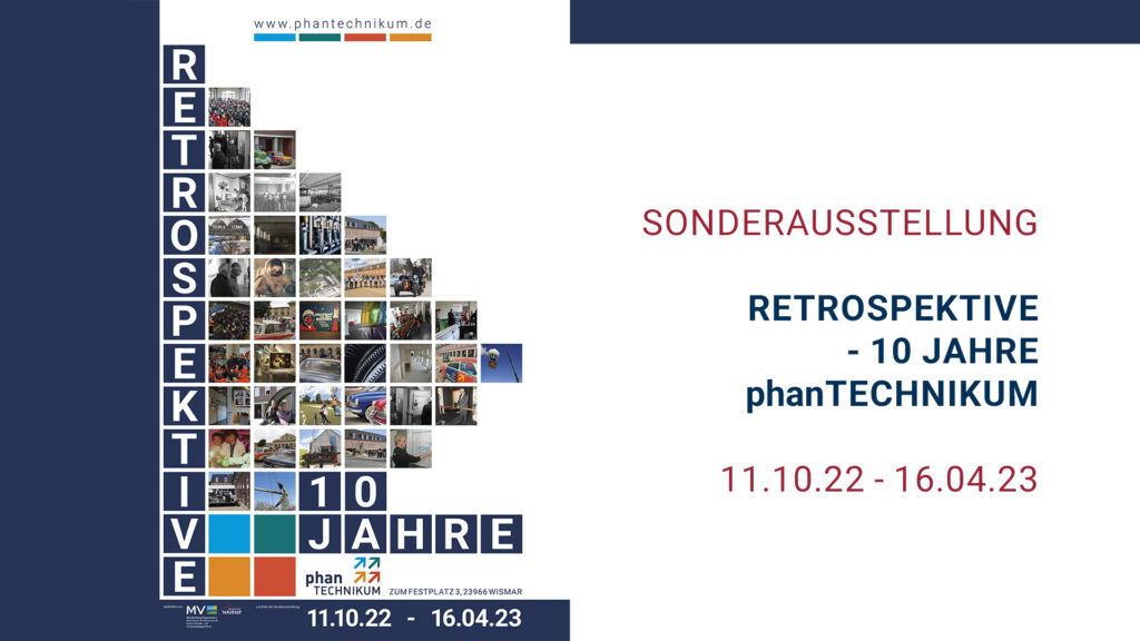 Zum Jubiläum präsentieren wir vom 11. Oktober 2022 bis zum 16. April 2023 die Sonderausstellung: RETROSPEKTIVE – 10 Jahre phanTECHNIKUM. Im Zentrum dieser Ausstellung steht die Historie des Technischen Landesmuseums MV, insbesondere die vergangenen 10 Jahre des Ausstellungshauses phanTECHNIKUM in Wismar.