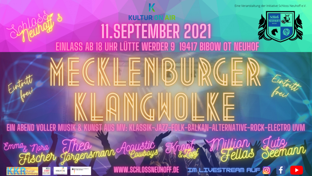 Ein Open Air der besonderen Art in einem ganz besonderem, aber auch für Mecklenburg typischen Ambiente. Im Gutshaus Schloss Neuhoff treffen sich an diesem Abend Generationen von Menschen und Musikrichtungen. Ein spannender Abend der musikalischen Musikreise. Wir eröffnen mit klassischer Musik mit Stefan, Emma und Nora Fischer (MV), setzen die Reise fort mit dem Jazzklarinettist Theo Jörgensmann (MV), die Band „Knopf & Zopf“ (MV) und nehmen die Besucher mit in die Welt von Folk, Latin und Balkanmusik. Weiter gehts mit Rock/Indie mit „Million Fellas“ aus MV. Ausklingen lassen wir diesen spannenden Abend mit elektronischer Musik von Lutz Seemann. Illuminationen der Umgebung (Bäume, etc.) und Lichtinstallationen auf dem Gutshaus runden die Klangwolke ab und machen diese Event zum multidimensionalen Erlebnis. Geplant ist auch ein kleiner Markt, bei dem sich Künstler*innen und andere Kultur „WunderPunkte“ aus der Region vorstellen.