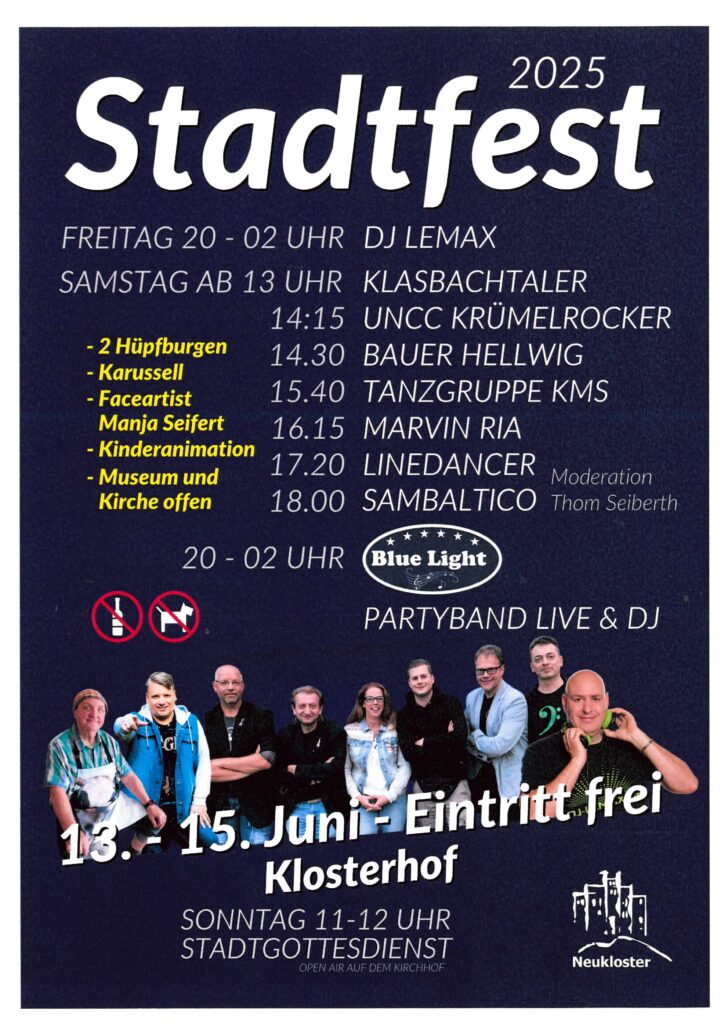 13.06.2025 20:00 Uhr - 15.06.2025 12:00 Uhr Stadtfest Neukloster Freuen Sie sich auf ein buntes Bühnenprogramm mit zahlreichen künstlerischen Darbietungen.