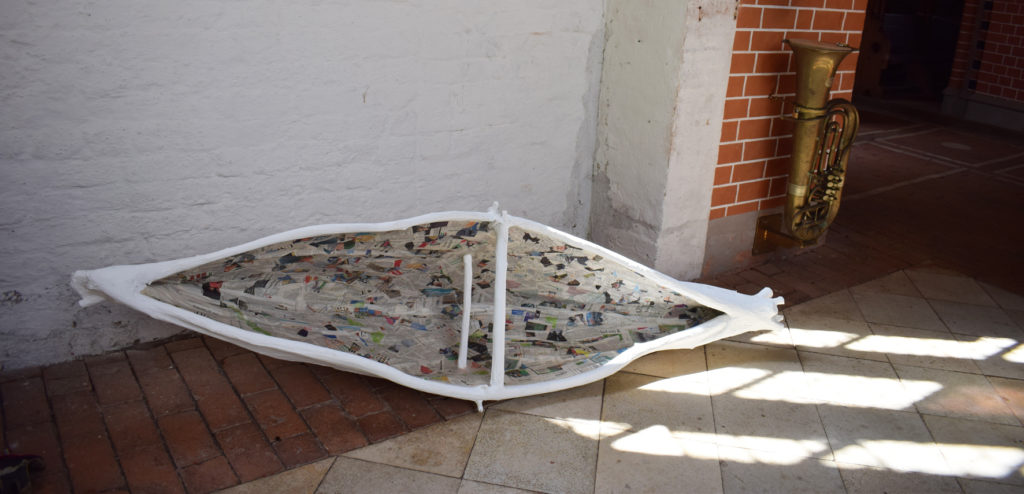 Fünf aus Weidenholz und Papier geformte Boote von Renate U. Schürmeyer liegen im Kirchenschiff. Sie bilden seit Ende Mai den Anfang für eine wachsende, sich verändernde Ausstellung. Während der Sommermonate besteht für Einheimische und Gäste das Angebot sich im Rahmen der offenen Kirche zu beteiligen. Boote aus den unterschiedlichsten Papieren und in den unterschiedlichsten Größen können direkt vor Ort gefaltet und platziert oder Bilder und Objekte zum Thema Boot mitgebracht werden.